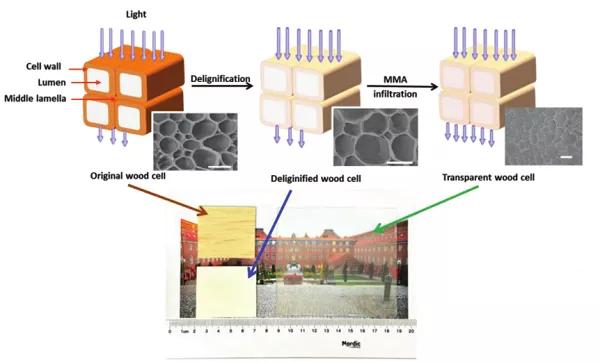 圖3 美觀木材的制作、微觀結(jié)構(gòu)和外觀。