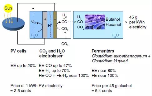 針對這一問題,德國西門子公司的Guenter Schmid(通訊作者)團隊[1]利用了可商用的銀基氣體擴散電極。該電極通常使用在工業(yè)規(guī)模的氯-堿電解過程中,而研究人員則以此電極作為二氧化碳電解槽的陰極。檢測發(fā)現(xiàn),由此形成的電解槽在超過1200小時的連續(xù)運行后,電流密度依然可高達300?mA cm–2。這一二氧化碳電解槽可被連接到發(fā)酵模塊(fermentation module),這樣一來,從電解槽出來的合成氣可以直接轉(zhuǎn)化成具有高碳選擇性的丁醇和己醇。研究計算顯示。光伏電能、二氧化碳和水轉(zhuǎn)變成醇類的法拉第效率可接近達到100%。利用這一雜化系統(tǒng),研究表示人工光合成高價值化學(xué)品(丁醇/己醇)可能達到幾萬噸每年的產(chǎn)量,已經(jīng)接近工業(yè)化規(guī)模水平。