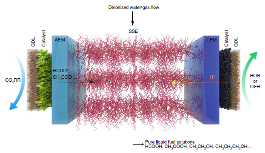 萊斯大學(xué)的汪淏田(通訊作者)團隊[2]利用固態(tài)電解質(zhì)在電池中實現(xiàn)了二氧化碳連續(xù)電催化轉(zhuǎn)化生成純液體燃料溶液。在這個過程中,電化學(xué)產(chǎn)生的陽離子(如氫離子)和陰離子(如甲酸根離子)相互結(jié)合形成不含其他離子的純產(chǎn)物溶液。在陰極上利用甲酸選擇性(法拉第效率大于90%)和極易規(guī)?;你G催化劑,研究證實了該過程可生產(chǎn)濃度達12M的純甲酸溶液。研究也展示了長達100小時的0.1M甲酸的連續(xù)穩(wěn)定生產(chǎn),同時催化選擇性和活性幾乎不變。同樣地,利用銅催化劑,研究還實現(xiàn)了如醋酸等其他無電解質(zhì)液體產(chǎn)物。這一工作在可規(guī)?;姵厣蠈崿F(xiàn)了二氧化碳電催化直接還原成甲酸的過程,展示了二氧化碳電還原的工業(yè)化前景。