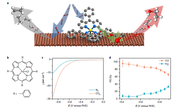多倫多大學(xué)的Edward H. Sargent(通訊作者)課題組[3]提出了一種分子-金屬催化劑表面的協(xié)同催化劑設(shè)計。這一設(shè)計旨在建立富含反應(yīng)中間體的局部環(huán)境,從而提高從二氧化碳和水電合成乙醇的能力。研究人員首先利用一系列能夠催化二氧化碳形成一氧化碳的卟啉基金屬復(fù)合物對銅表面進行功能化,再利用DFT計算和拉曼、X射線等譜學(xué)表征,發(fā)現(xiàn)局部一氧化碳展現(xiàn)出高濃度特點,能夠有利于碳碳耦合、控制反應(yīng)路徑以高效生產(chǎn)乙醇。驗證實驗的結(jié)果,二氧化碳-乙醇轉(zhuǎn)變的局部電流密度也達到了(124?mA?cm?2)(?0.82 V vs RHE),但由于抑制氫氣生成的問題沒有解決,其法拉第效率略有下降(41%)。這一催化劑后又被集成到薄膜電極組裝系統(tǒng),也實現(xiàn)了13%左右的全局能量效率。