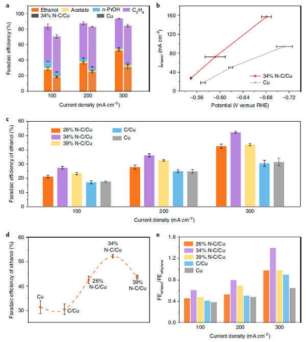 而在二氧化碳電還原反應(yīng)中,乙醇和乙烯是兩種主要的C2競爭產(chǎn)物。一般認為,這兩種產(chǎn)物衍生自共同的關(guān)鍵中間體(HOCCH*),HOCCH*中碳氧鍵斷裂產(chǎn)生了乙烯。對二氧化碳電還原反應(yīng)進行技術(shù)經(jīng)濟分析發(fā)現(xiàn),只有當局部電流密度超過100 mA cm?2時,C2產(chǎn)物才會開始產(chǎn)生經(jīng)濟效益。這意味著即使二氧化碳電還原反應(yīng)的全局電流密度超過10 mA cm?2,乙醇產(chǎn)物的法拉第效率需要進一步提高才能推進商業(yè)化。Edward H. Sargent(通訊作者)的團隊[5]報道了一類可實現(xiàn)52%左右乙醇法拉第效率和31%乙醇陰極能量效率的催化劑。研究發(fā)現(xiàn),在銅表面涂覆氮摻雜碳層,賦予了催化劑強大的供電子能力,可以在HOCCH*中提高碳碳鍵的耦合、抑制碳氧鍵的斷裂,從而增強二氧化碳電還原過程中的乙醇產(chǎn)物選擇性。根據(jù)該研究的數(shù)據(jù),利用氮摻雜碳層改性后銅催化劑在電流密度超過100 mA cm?2時的總法拉第效率高達83%,乙醇的法拉第效率也大幅提高,超過了已有報道的最佳數(shù)值(41%)。