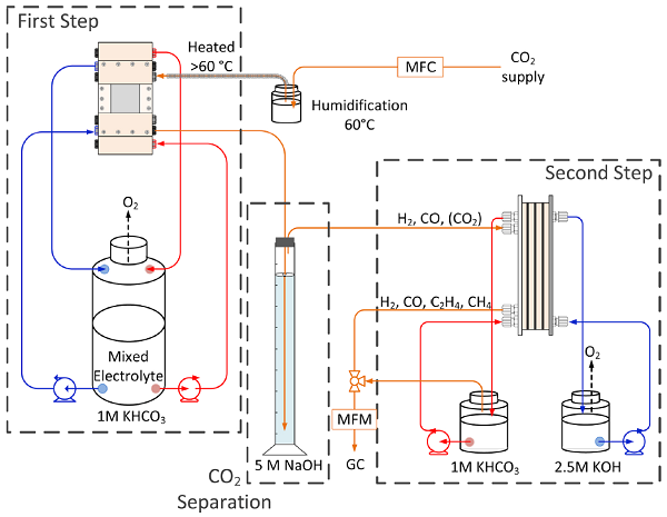 而近期,西門子公司的N. S. Romero Cuellar(通訊作者)等人[7]提出了一種新型的兩步電解法,展示了其工業(yè)化前景。作者利用兩塊分別以銀和銅作為氣體擴散電極的液流電池,將兩步二氧化碳電化學(xué)還原過程進行集成化。在這一集成系統(tǒng)中,作者實現(xiàn)了電解質(zhì)、氣體和電極之間的巨大三相邊界區(qū)域,由此可以在工業(yè)級電流密度水平操作運行電化學(xué)還原過程。作者首先利用電壓/電流密度變化線掃分別研究兩個電解槽;而在分析第二個電解槽時,作者假定供應(yīng)第一步的二氧化碳不會全部轉(zhuǎn)化成一氧化碳,即第一步的產(chǎn)物氣體是一氧化碳/二氧化碳的混合氣。以此假定,作者研究了不同比例混合氣的電還原反應(yīng),并發(fā)現(xiàn)二氧化碳的占比越高一氧化碳轉(zhuǎn)換成多碳產(chǎn)物的效率越低。因此,作者在第二步中用氫氧化碳吸附二氧化碳,從而有效增加集成系統(tǒng)的全局法拉第效率。根據(jù)計算,這一兩步策略的多碳產(chǎn)物(C2和C3)累計法拉第效率可以達到62%。