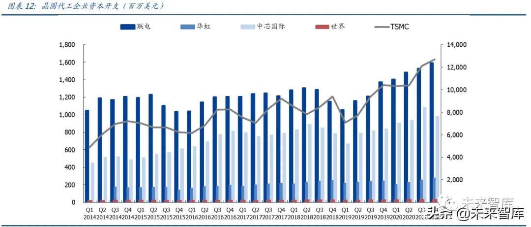 Capex 進入上行期,臺積電、中芯國際紛紛增加資本開支。臺積電從 2020 年 170 億美 金增長到 300 億美金(用于 N3/N5/N7 的資本開支占 80%),再到 2021 年 4 月 1 日公 布的未來三年資本開支 1000 億美金;聯電從 2020 年 10 億美金增長到 23 億美金(用 于的 12 寸晶圓的資本支出占 85%);華虹從 2020 年 11 億美金增長到 2021 年 13.5 億 美金(大部分用于華虹無錫 12 寸);中芯國際 2021 年資本維持高位,達到 43 億美金 (大部分用于擴成熟制程,尤其是 8 寸數量擴 4.5 萬片/月),開啟新一輪資本開支。