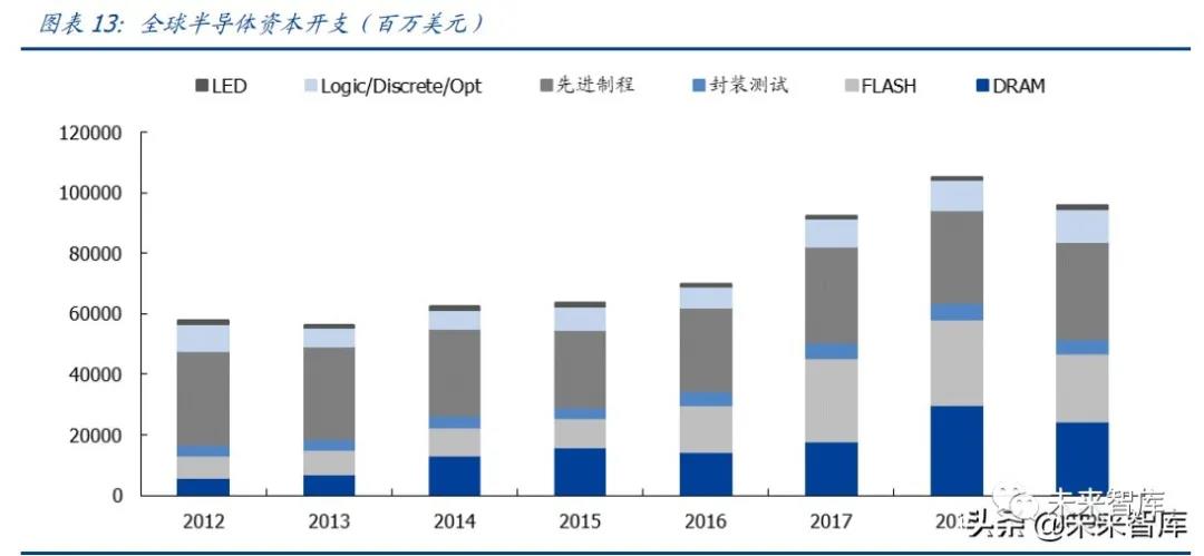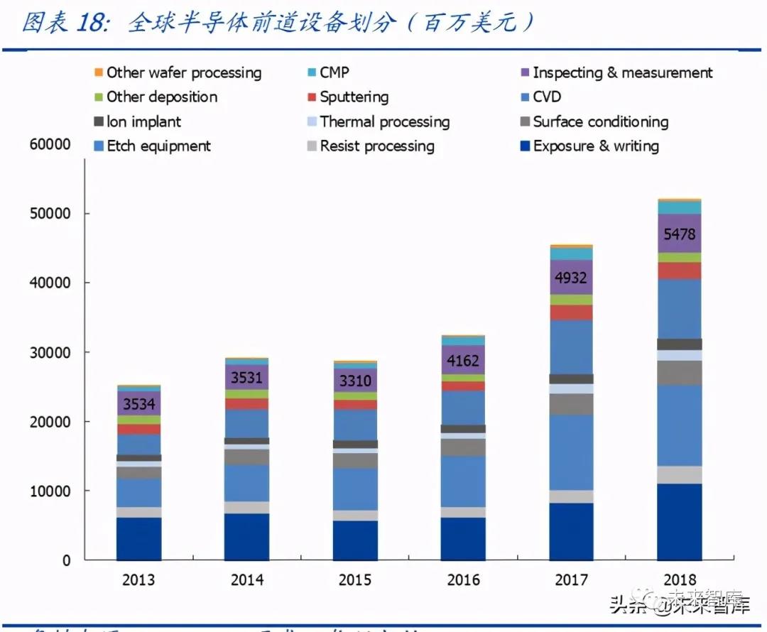 測試需求增長更快。半導體設備 2013~2018 年復合增長率為 15%,前道、封裝、測試分別為 15%、11%、16%。增速最快的子項目分別為刻蝕設備(CAGR 24%)和存儲 測試設備(CAGR 27%)。