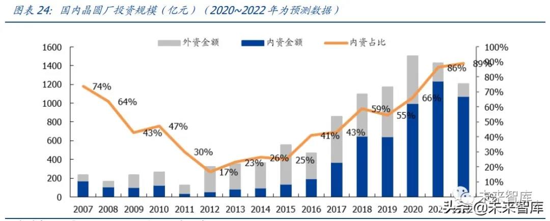 國內晶圓廠投資金額即將進入高峰期。根據統(tǒng)計,2020~2022 年國內晶圓廠總投資金 額約 1500/1400/1200 億元,其中內資晶圓廠投資金額約 1000/1200/1100 億元。2020~2022 年國內晶圓廠投資額將是歷史上最高的三年,且未來還有新增項目的可能。
