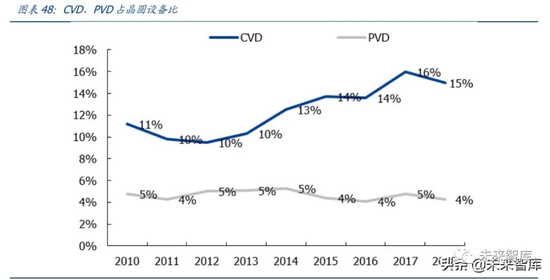 薄膜設備中,CVD 使用越來越廣泛。2018 年晶圓設備市場,沉積設備占比為 22%, CVD 占 15%,PVD 占 4%,其他還有 ECD、MOCVD、SOD、外延等。