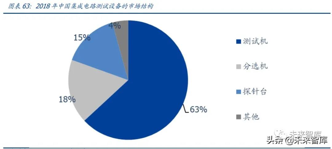 隨著國內封測廠陸續(xù)投入新產線,產能實現擴張,將持續(xù)帶動國內半導體測試設備市場 高速增長。根據 SEMI,2018 年國內集成電路測試設備市場規(guī)模約 57.0 億元,集成電路 測試機、分選機和探針臺分別占比 63.1%、17.4%和 15.2%,其它設備占 4.3%。