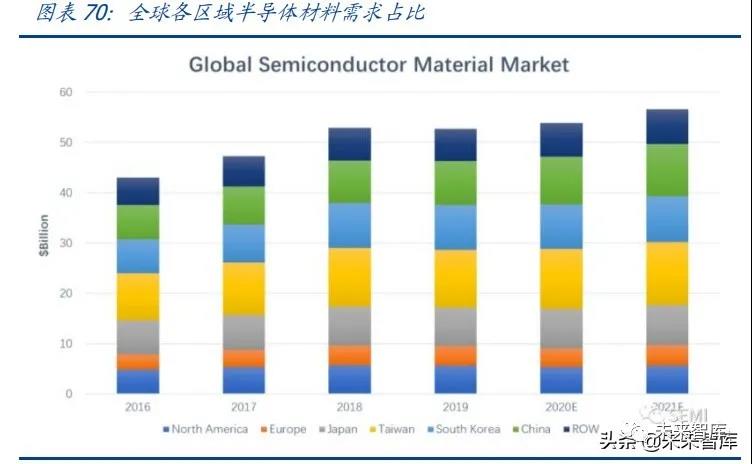 在 2019 年期間,整個半導體材料 521 億美元的市場規(guī)模之中,半導體晶圓制造材料占 據了約 63%,達到了 328 億元。晶圓制造材料的持續(xù)增長也是源自于當前制造工藝不 斷升級帶來的對于材料的更大的消耗所致。