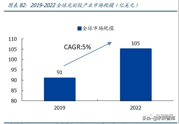 從光刻膠全球市場來看,根據 Cision 的統(tǒng)計,2019 年約有 91 億美元的市場規(guī)模,且至 2022 年預計將達到 105 億美元,實現復合增長 5%。而其中半導體、LCD、PCB 這三類 主要的應用場景分別占據了市場空間的24.10%、26.6%、及24.5%,分別對應2019年 的市場規(guī)模 22 億美元、24 億美元、及 22 億美元。