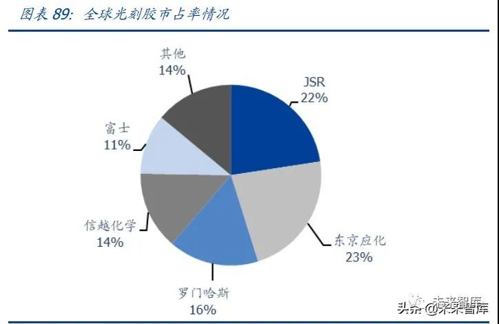 整體來看,全球光刻膠行業(yè)主要被 JSR、東京應化、羅門哈斯、信越化學、及富士合理 占據,前五大家占據了全球光刻膠領域的 86%;如若聚焦到全球半導體用光刻膠領域, 前六大家(主要以日本為主)實現了對于市場的 87%的占據。