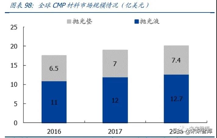 至 2018 年市場拋光液和拋光墊市場分別達到了 12.7 和 7.4 億美元,其中中國市場的需 求量大約為全球市場容量的 16.7%,即對應市場規(guī)模為:拋光液+拋光液=23 億人民幣。