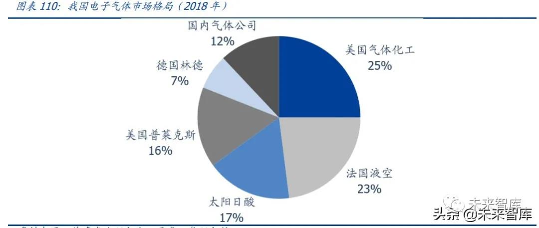 然而,目前我國電子特氣進口依賴度高,進口替代潛力較大。隨著我國半導體、顯示面 板市場的快速擴張,包括電子特氣在內的上游原材料實現進口替代意義重大。目前我國 電子特種氣體市場呈寡頭壟斷格局,2018 年外企占我國電子氣體市場 88%份額。我國 電子氣體領域目前的主要的外企包括美國空氣化工集團、法國液化空氣集團、日本太陽 日酸株式會社、美國普萊克斯、德國林德集團。國內主要企業(yè)包括中船 718 所、昊華黎 明院等。目前我國電子特氣企業(yè)產品供應仍較為單一,但在政策扶持及下游需求的拉動 下,我國電子特氣企業(yè)體量、產品品種迅速發(fā)展,該領域進口替代已拉開序幕。