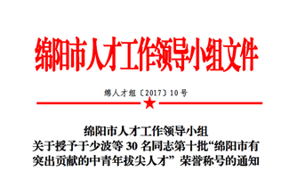 于少波董事長榮獲第十批“綿陽市有突出貢獻的中青年拔尖人才”榮譽稱號